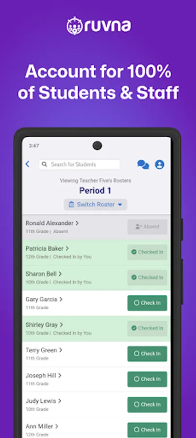 As teachers indicate which students they have, Ruvna compiles a list of students that no teacher has claimed. This information, and more, is displayed in real-time to administrators and law enforcement on our intuitive dashboard.