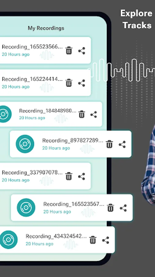 In this, you can easily record the background sound. The recorded sound is saved in the My Recordings. From the My Recordings, you can easily delete and share the recording on social media.