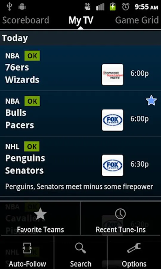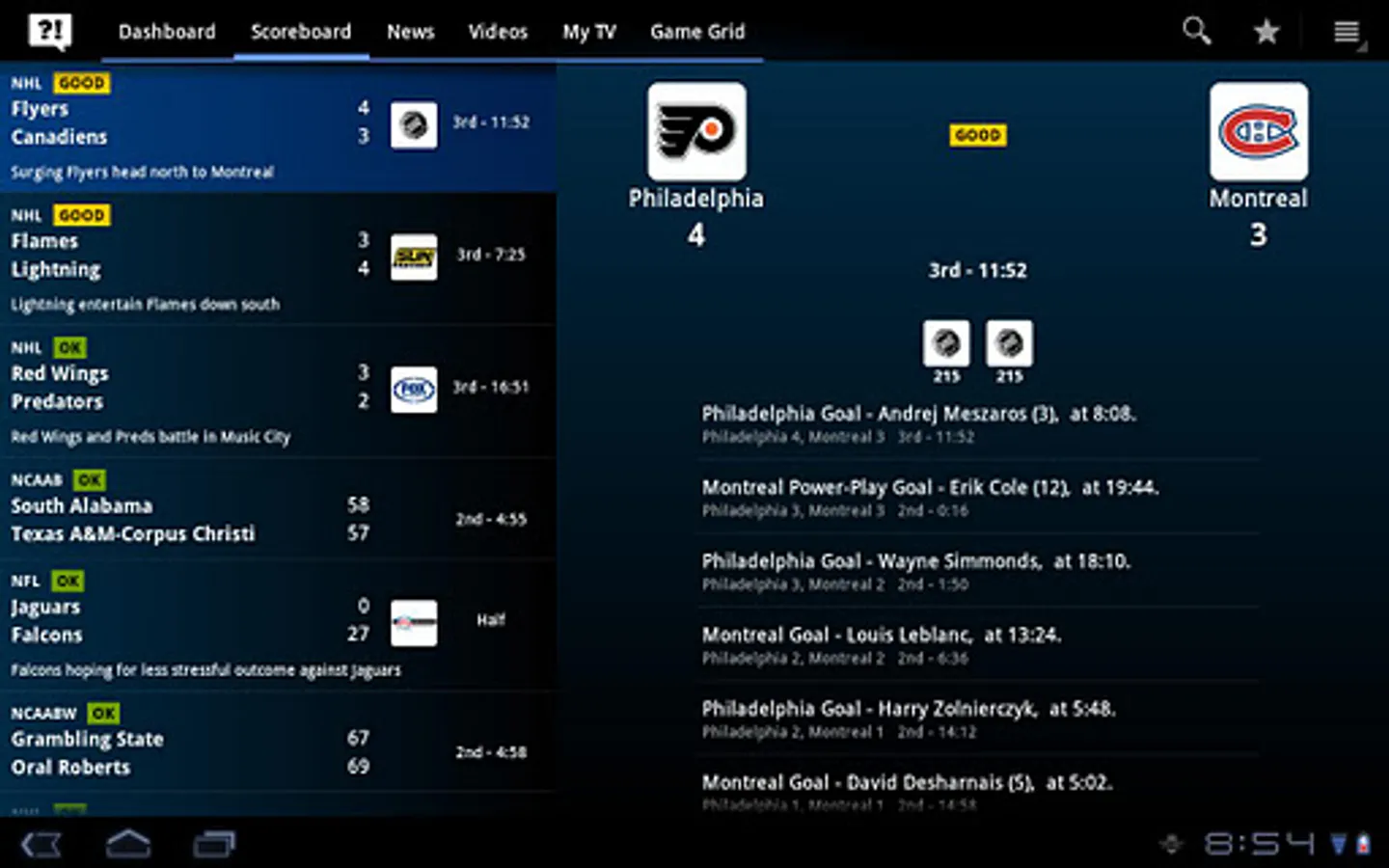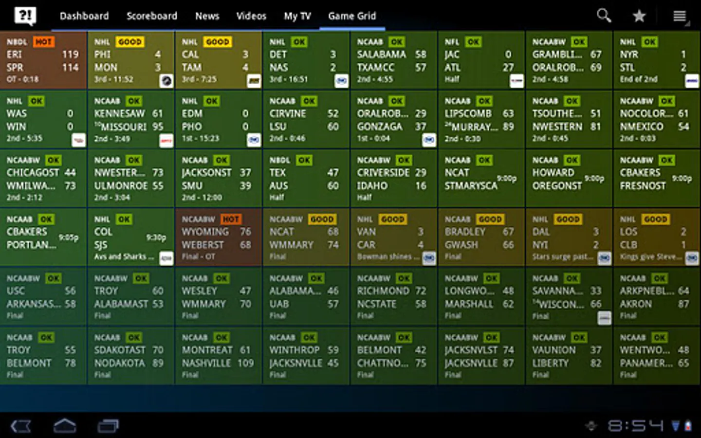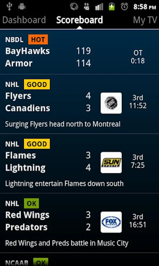 Scores, News, and TV Listings for: Arena Football, Auto Racing (NASCAR, F1, IRL), Men's College Basketball, Women's College Basketball, College Football, MLB, NBA, NFL, CFL, NHL, Soccer (MLS and World Cup), and the WNBA.