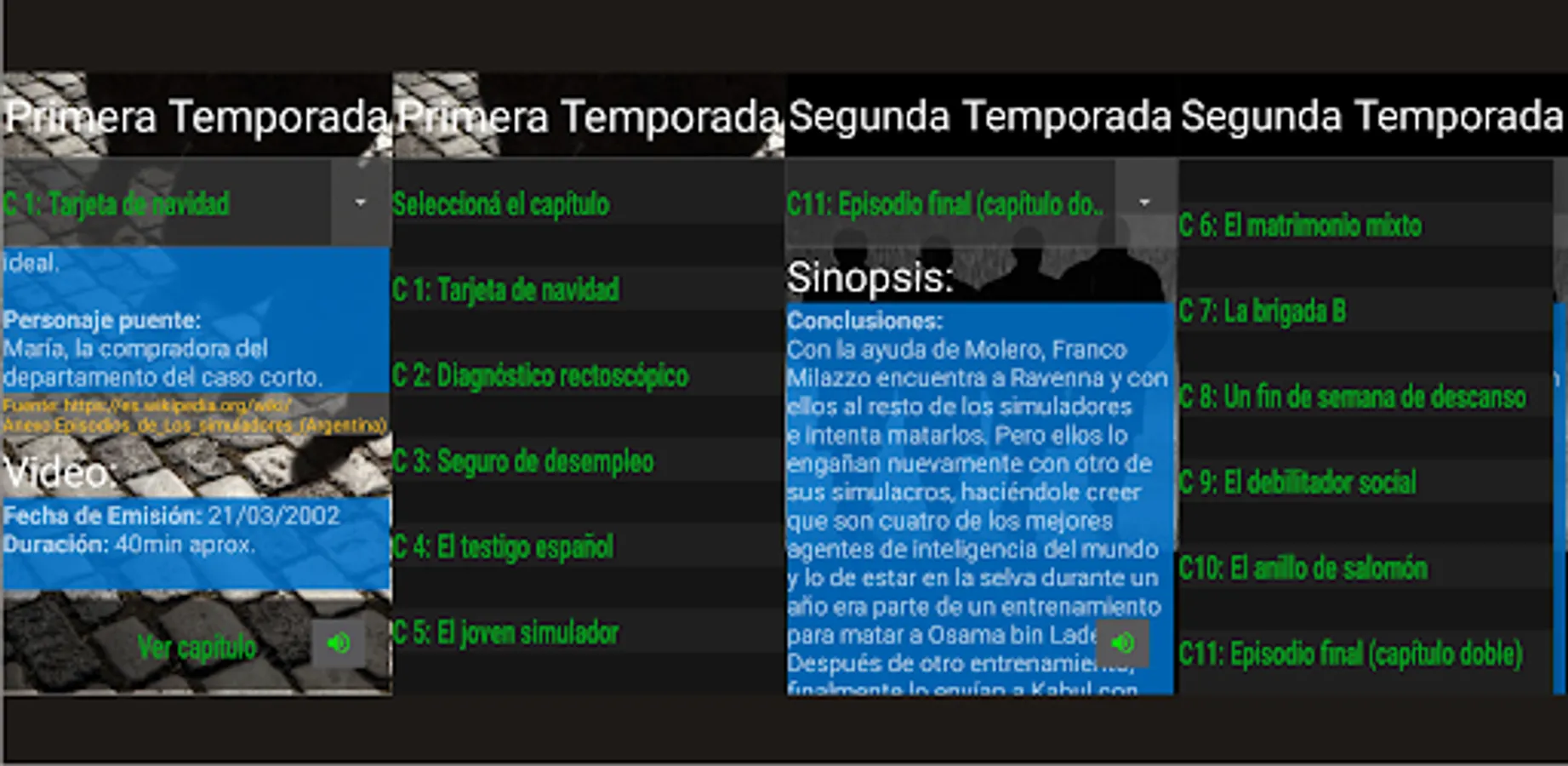 Application with the complete list of chapters including the corresponding synopsis of each one, accessing their videos, as well as promotions, intros and clips from Internet sites or pages with the possibility of updating the content.