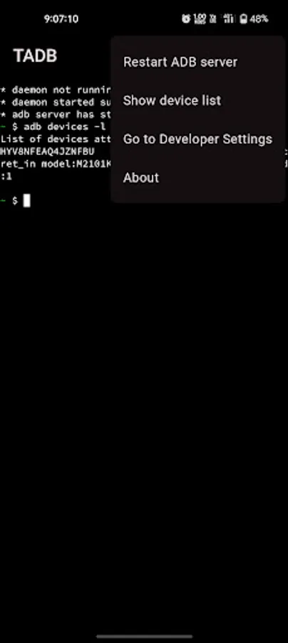 TADB bundles an ADB server within the app. Normally, this server cannot connect to the local device because it requires an active USB connection. However, Android's Wireless ADB Debugging feature allows the server and the client to connect to each other locally.