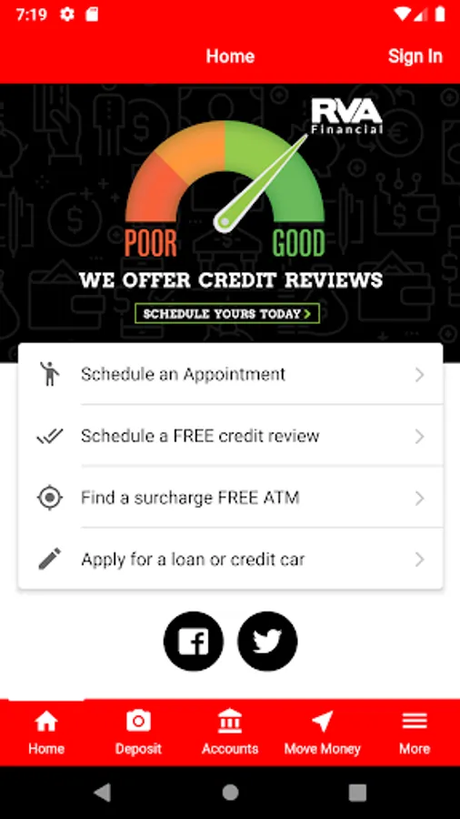 Our new mobile app provides members convenient access to RVA Financial's mobile website, mobile check deposit, mobile banking, branch & contact information, and help.