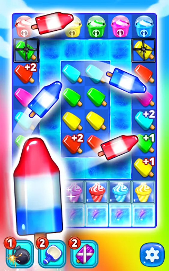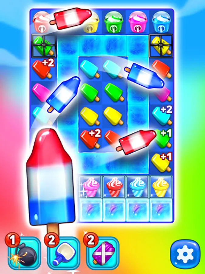 The Ice Cream Paradise puzzle world gets even more exciting when you create power-ups. Make a 3 match with extra desserts to create special candy items that can clear huge portions of the screen. Got a few cookies in the way? Need to blitz those frozen treats into oblivion? Time to make a power-up and blast them to pieces.