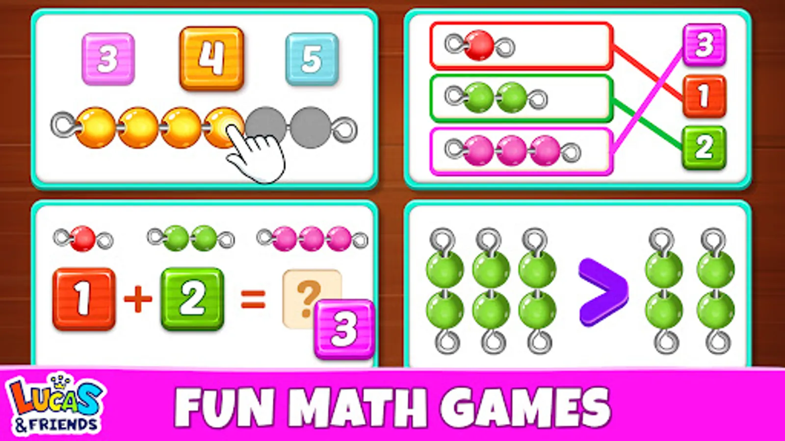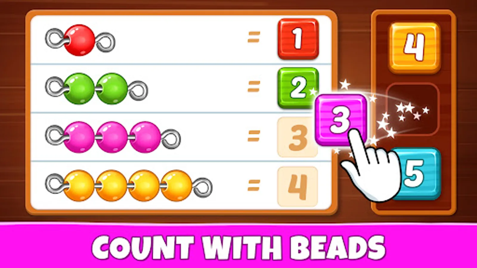 Kids can learn counting and math skills using the time-tested beads method. Choose between various math exercises for kids, then watch how quickly your child learns! Games in this mode include counting exercises, learning place values (ones, tens, hundreds), and simple math operations like adding and subtracting.