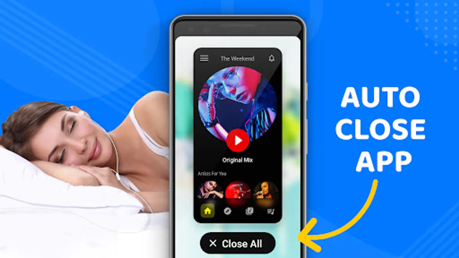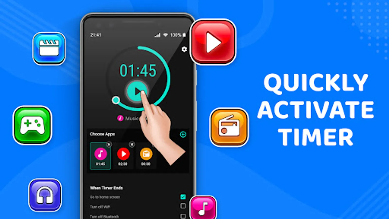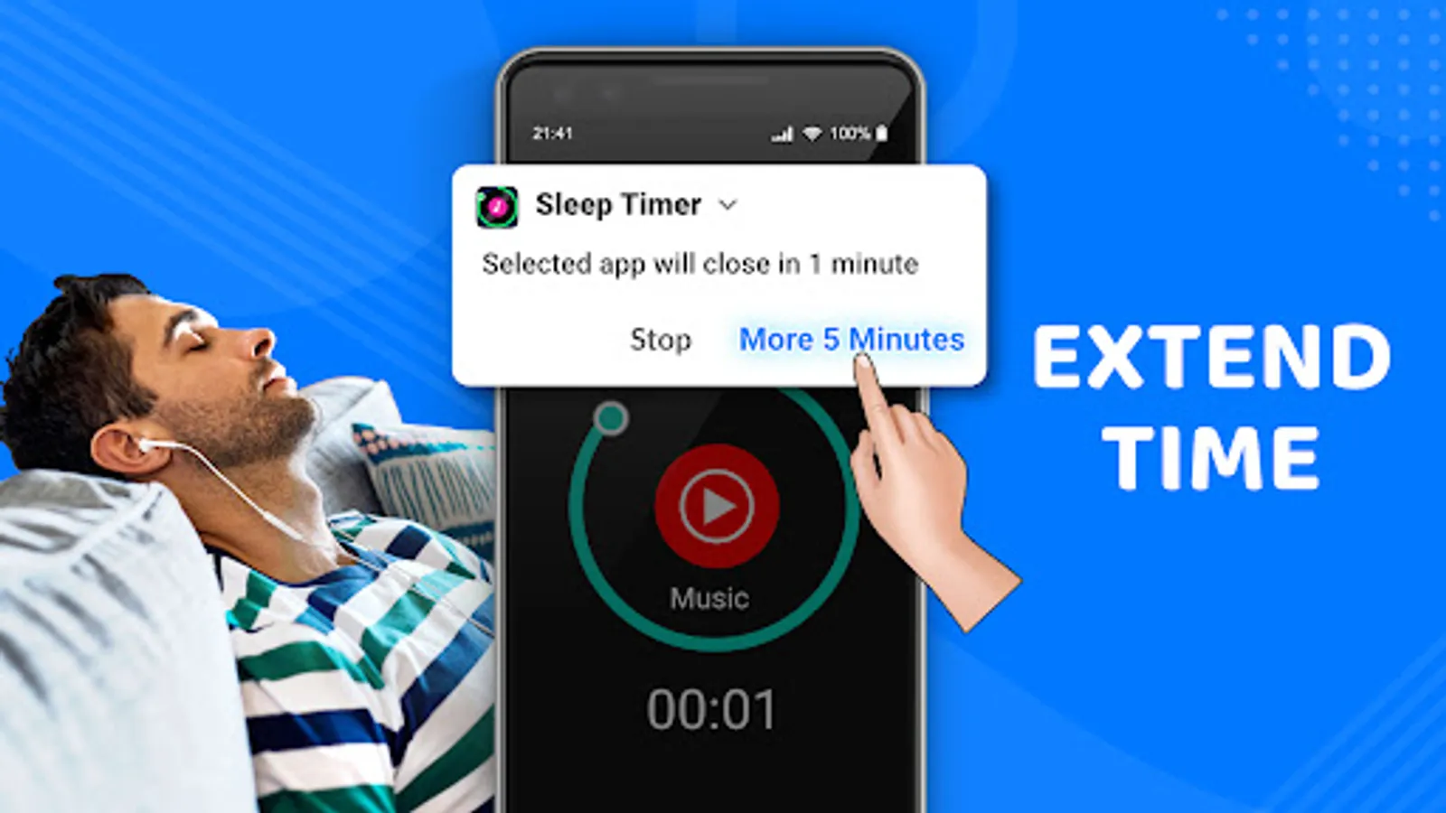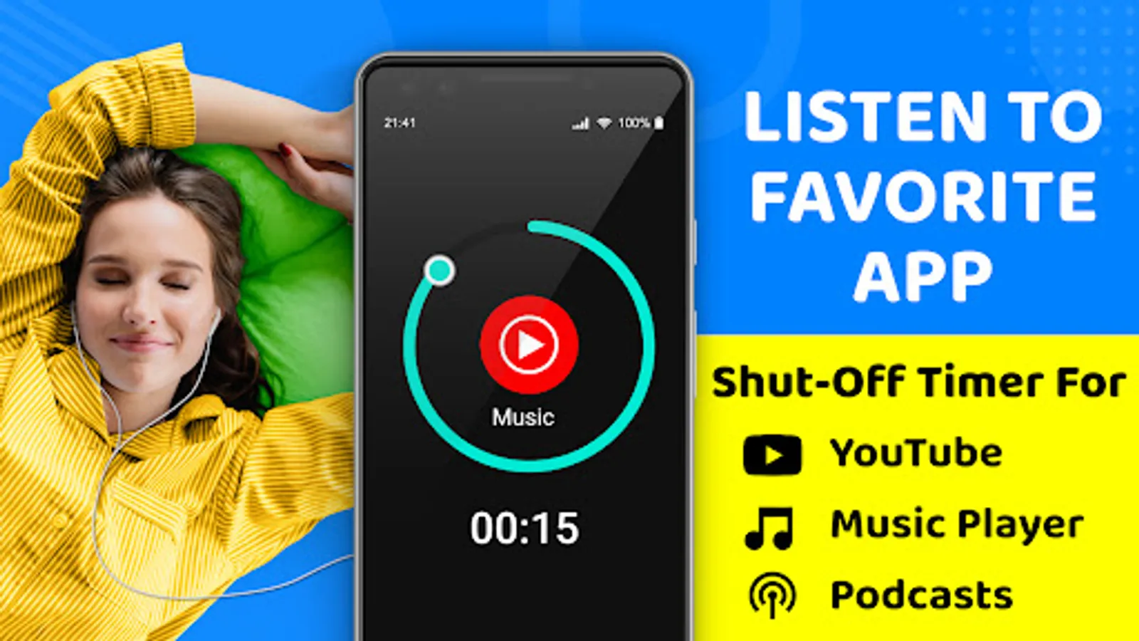 To use sleep timer all you have to do is start listening to music or white noise on your favorite app (Spotify, Youtube) as you fall asleep. Set a timer on the app before you put your phone down, and when the countdown runs out, sleep timer will automatically stop the music or even turn off your phone! It doesn't matter if you're playing white noise videos or listening to a podcast music, the app will take care of your phone to save you battery.