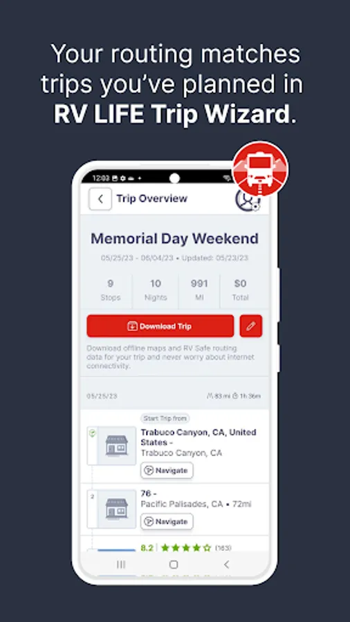 We teamed up with RV Trip Wizard, the popular RV trip planner. You can access your planned trips & use our RV GPS to navigate safely to your next destination.