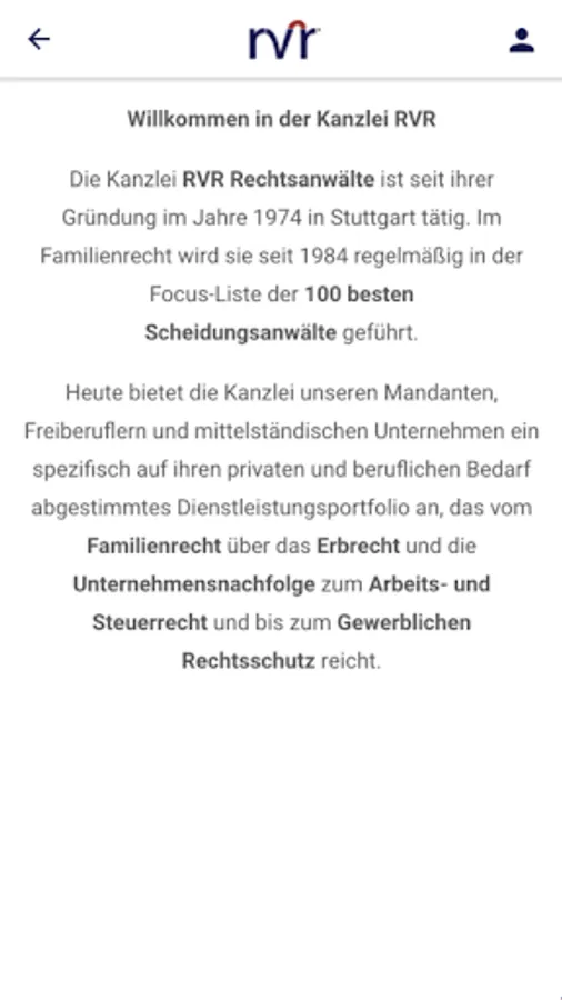 This app is a service developed by Dr. Volker Rabaa founded the law firm of RVR Rechtsanwälte. The range of services has been continuously expanded since then. Conflict management and mediation are key terms for friendly solutions today. With efficient partners, we have created a consulting system and offer our clients, freelancers and medium-sized companies (SMEs) complete solutions from a single source. In all vicissitudes of life, from family law to inheritance law and company succession, we accompany you with the right solution.