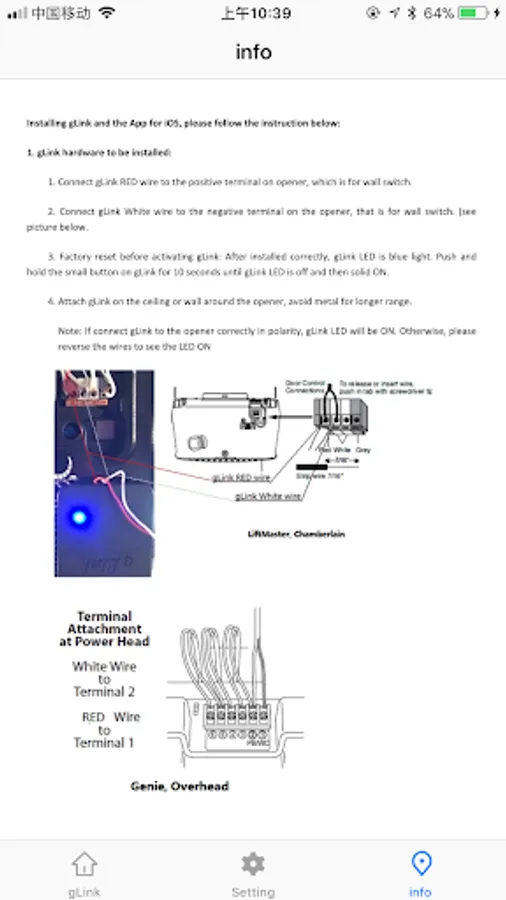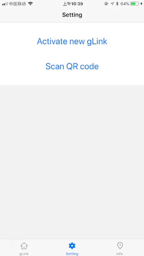 2. Setting page: The user has to activate the controller (hardware) firstly by clicking the "Activating New gLink" before use it. After activating, the QR code will be created on setting page about the Hardware information (that is for other users to use for registering to hardware ), and the Door Icon is created on Home Page. The other user want to use this controller, will use new iPhone to click "Scan QR code" on the setting page near the hardware to Scan this QR code, then the user info can be stored in hardware, and then the new QR code (hardware info) shown on the setting page and the Door Icon on the home page created. Then, the user can open or close the garage door by clicking the Door Icon on Home Page.