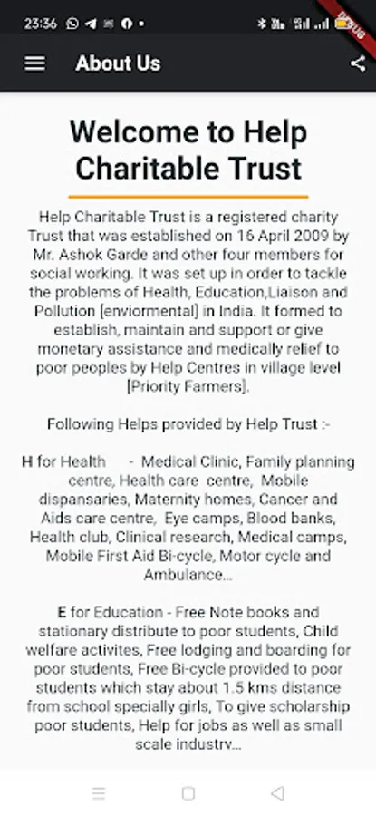Help Charitable Trust is a registered charity Trust that was established on 16 April 2009 by Mr. Ashok Garde and other four members for social working. It was set up in order to tackle the problems of Health, Education,Liaison and Pollution [enviormental] in India. It formed to establish, maintain and support or give monetary assistance and medically relief to poor peoples by Help Centres in village level [Priority Farmers].