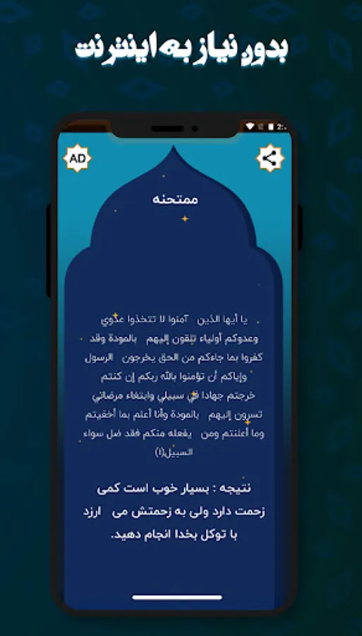 In the program of Istikharah with Quran with full interpretation, you can see the text of the verse, the number of the verse and the selected surah, and you can also share the result of Istikharah.