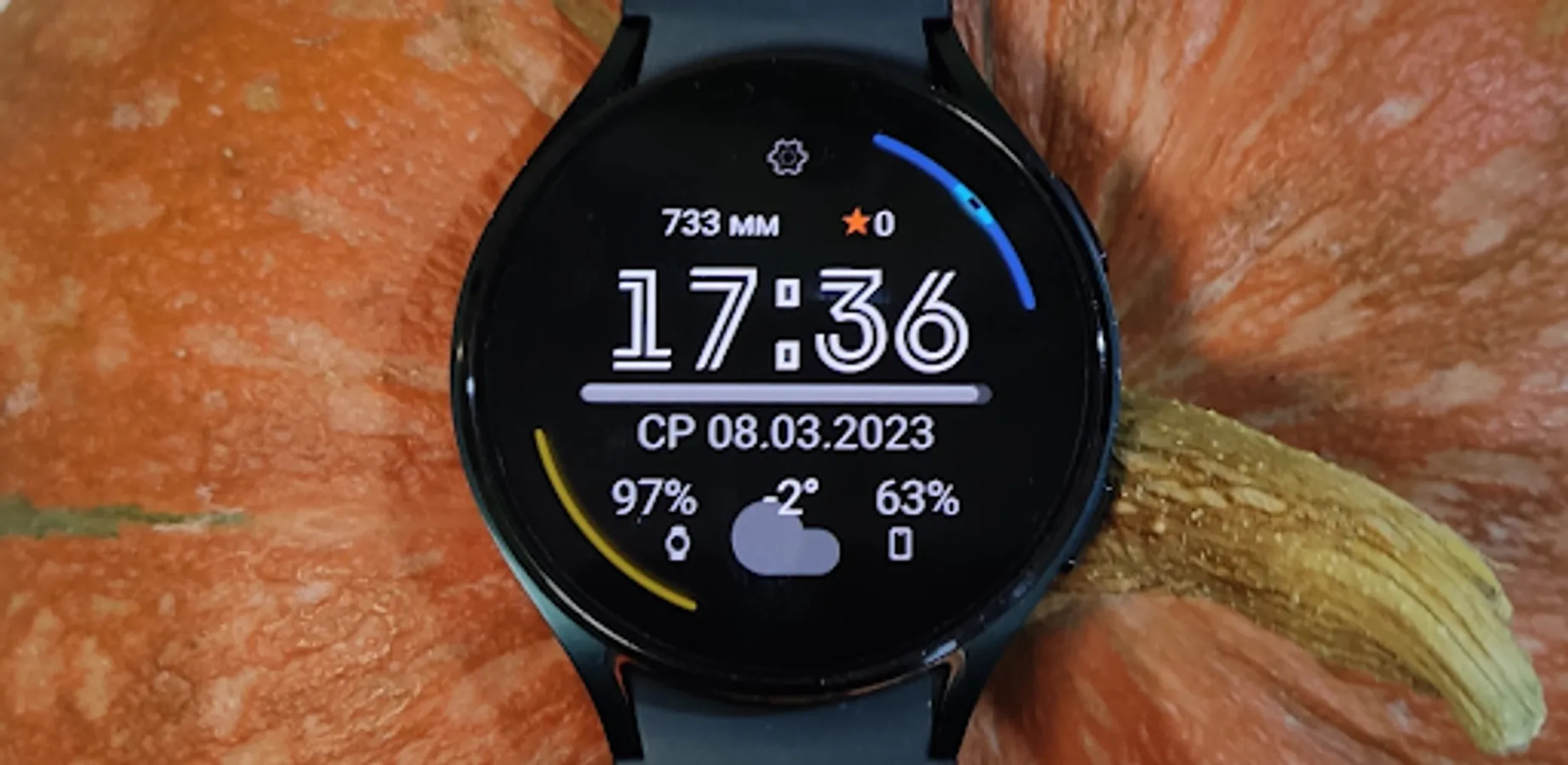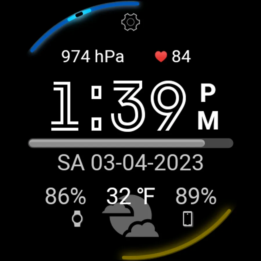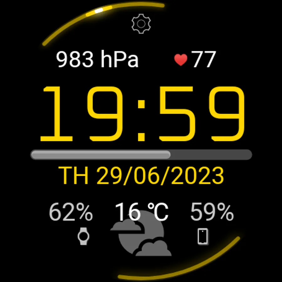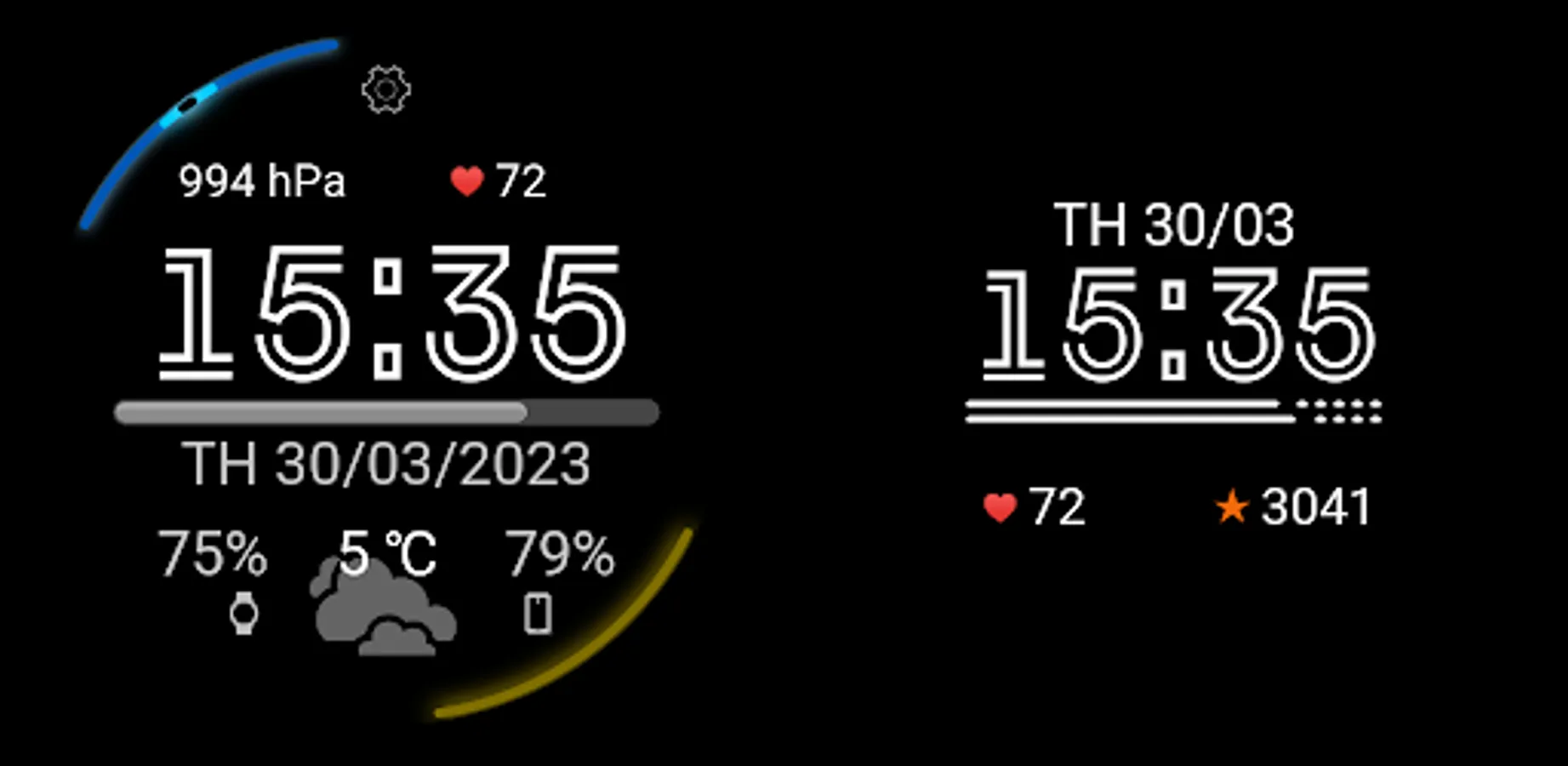 On the left and right at the top of the main one, you can select (in the "Watch Face" menu) the displayed data from 2 identical lists: Watch barometer, pulse from the watch sensor, steps from the watch sensor or text data from the widget of any application of your choice (select "Widget" in the menu ").