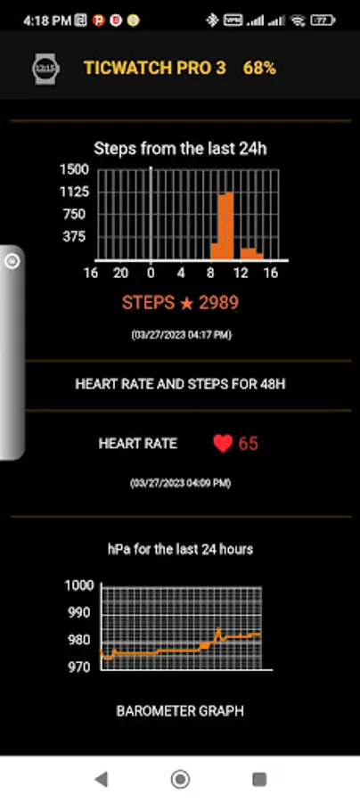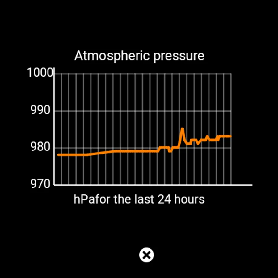 Clicking on the barometer numbers will show a graph of barometric pressure values for the last 24 hours of measurement. The first data on the graph will appear at least 1 hour! The same barometer graph can be seen on the phone.