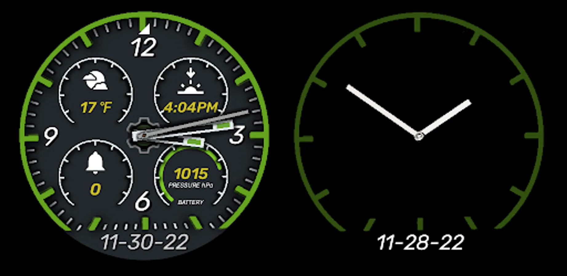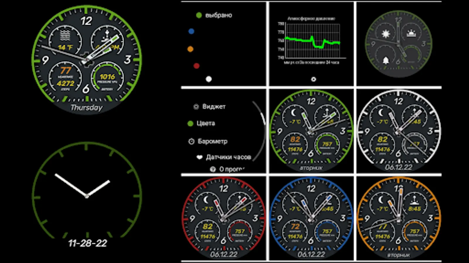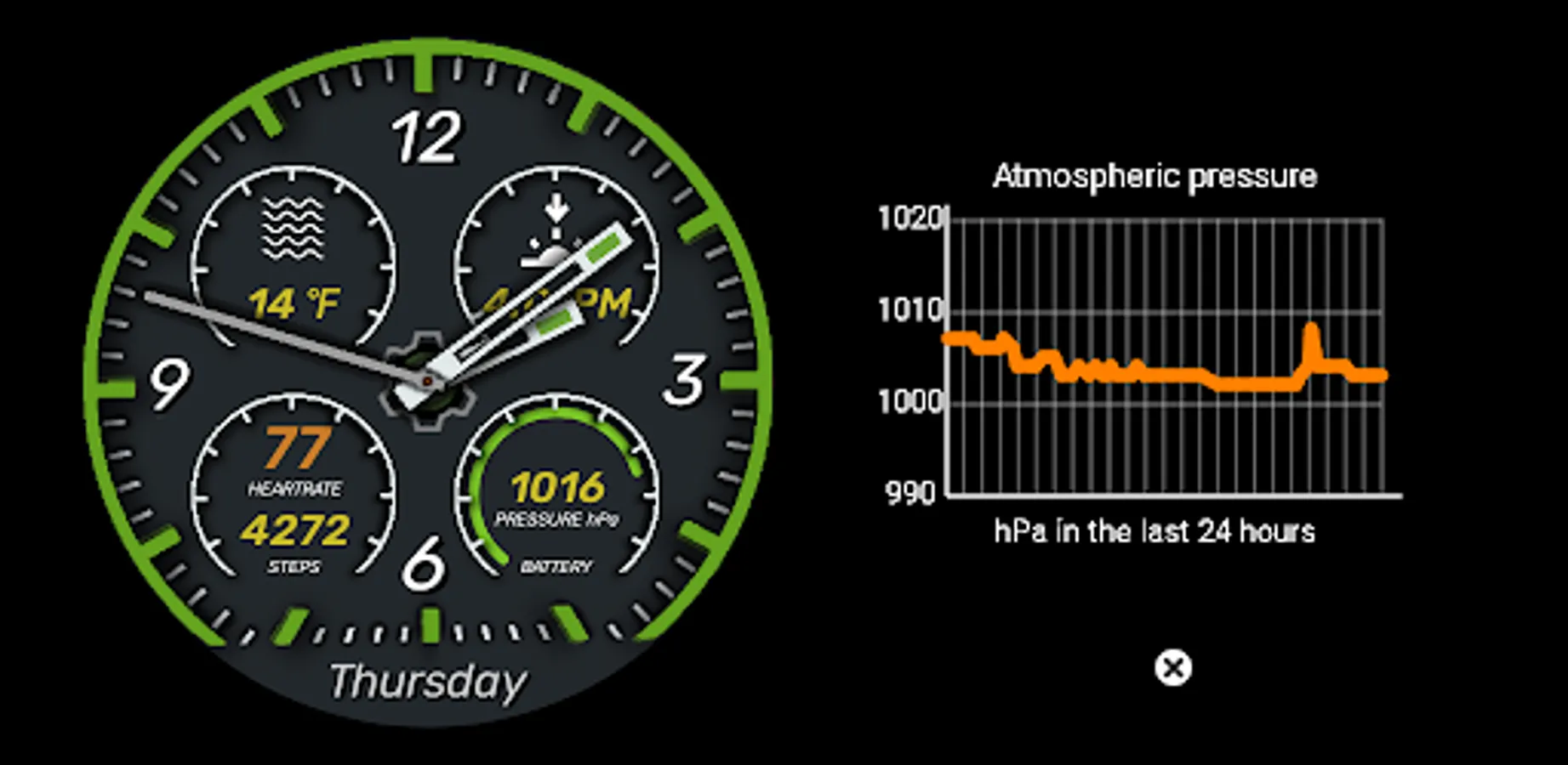 The application remembers the athmospheric pressure data from the sensor built into the watch (if it is installed in your watch) 4 times per hour and draws a chart for the last 24 hours. Touch pressure value to open barometer chart. Please be patient to view first data on chart. The pressure representation in hPa or mmHg is selected automatically depending on your locale.