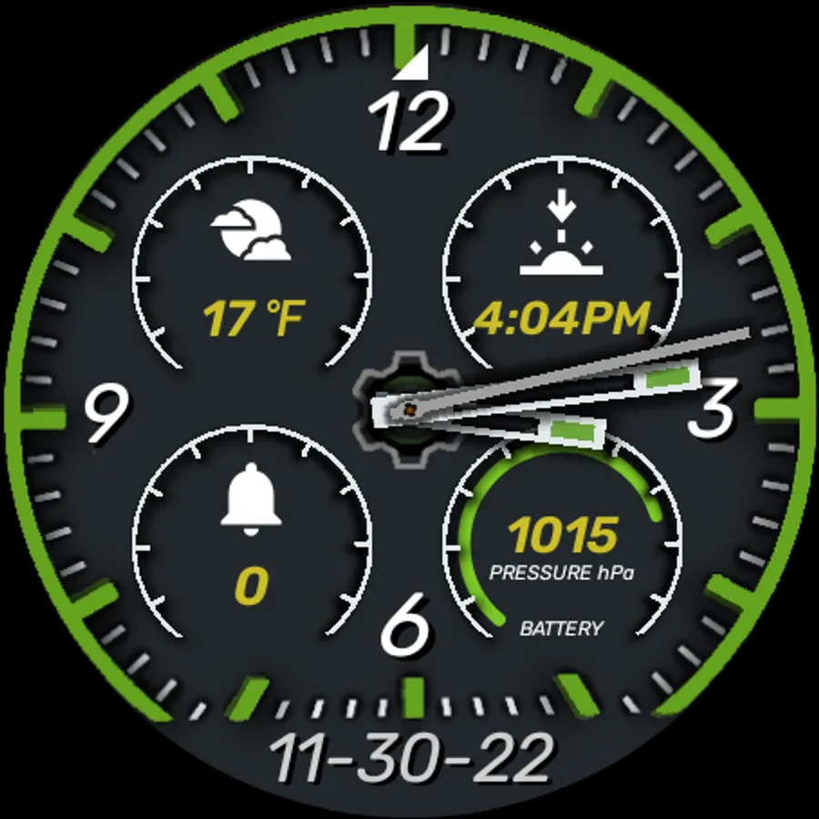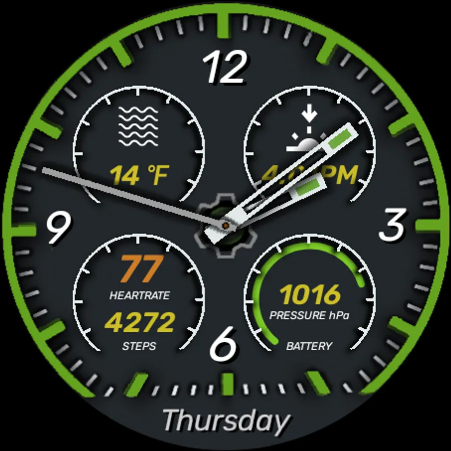 Set up 3 complications (widgets) of your choice from the system set or installed programs (attention: some widgets may not display correctly, please report). Optionally, replace the bottom left widget with bodysensor data (functionality depends on your watch).