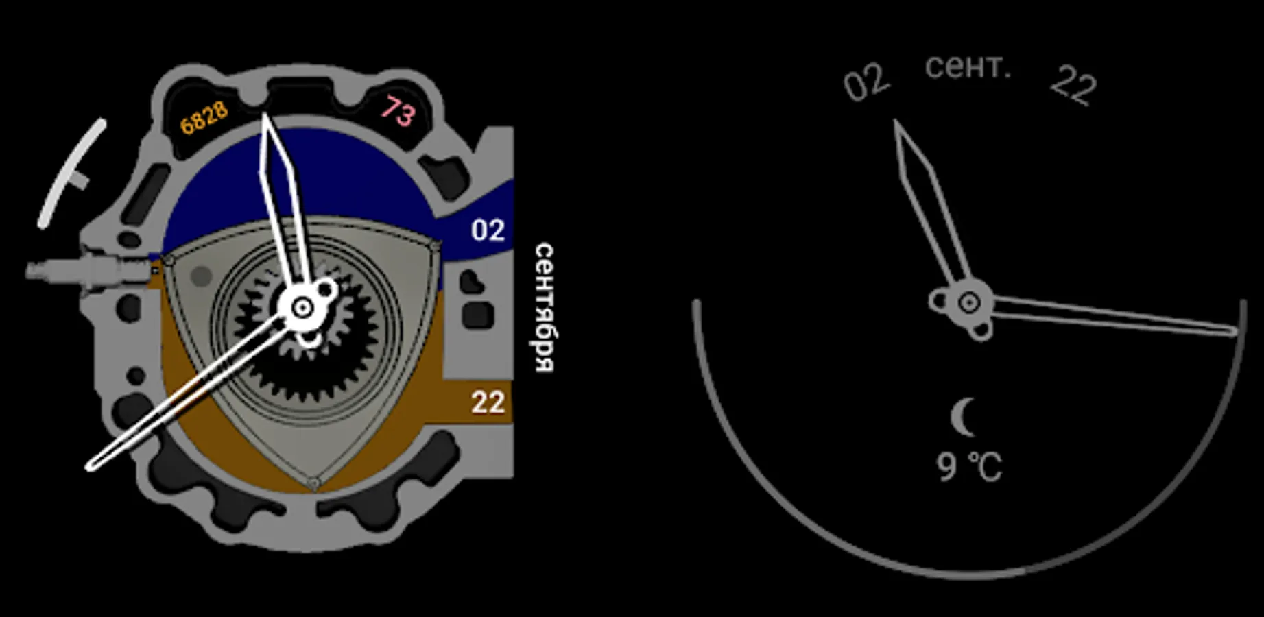 The watch face shows the principle of operation of the Wankel rotary engine.