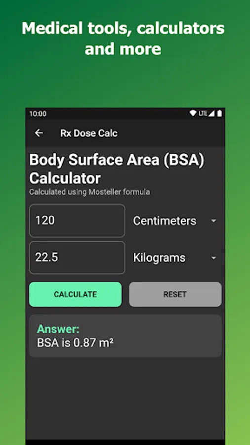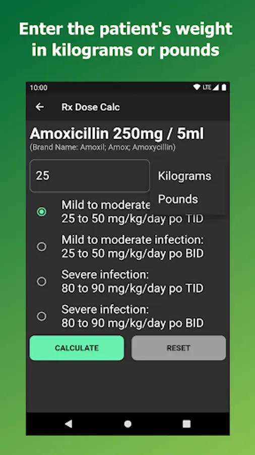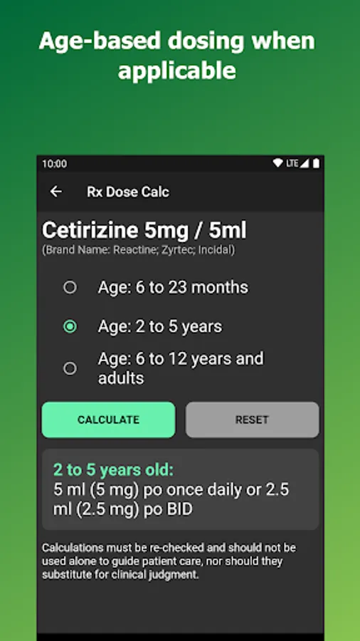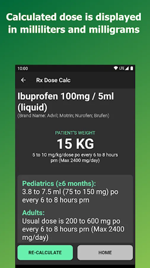 • The accurate calculated dose is displayed in both millilitres and milligrams. A handy feature if the drug is available in your country but in different strength.
