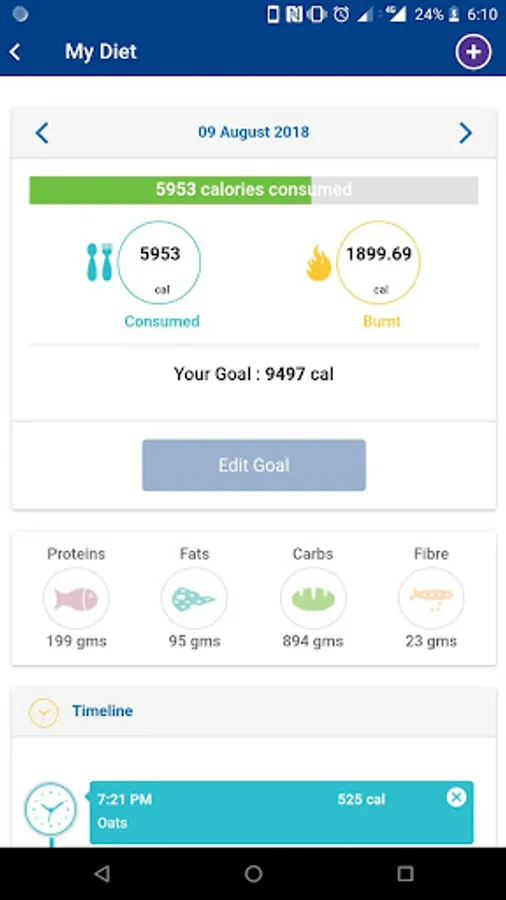 • Diet tab that allows the patient to view diet, associated calories and manage goals