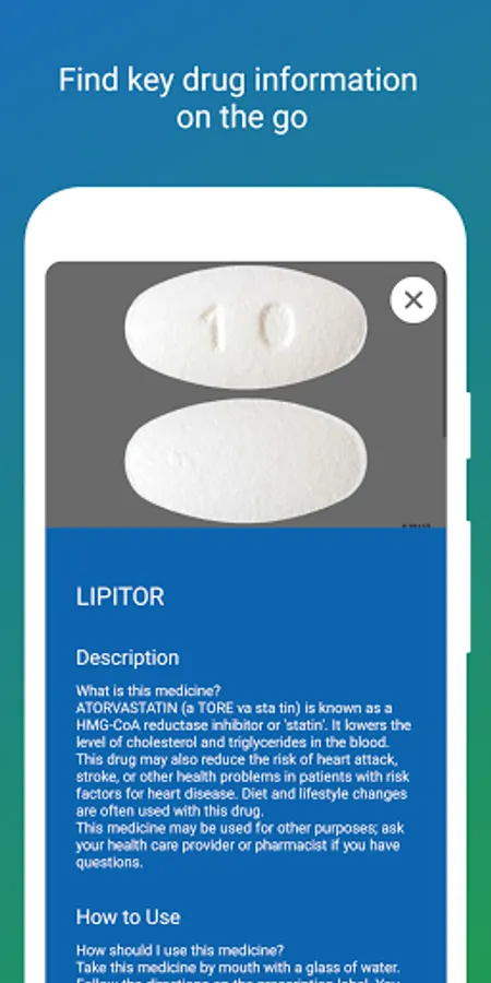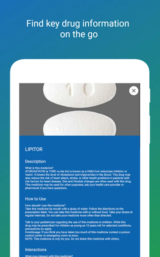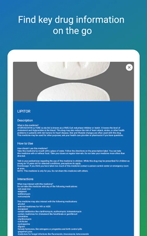 Check comprehensive drug information, side effects, interactions and other medication details using the app.