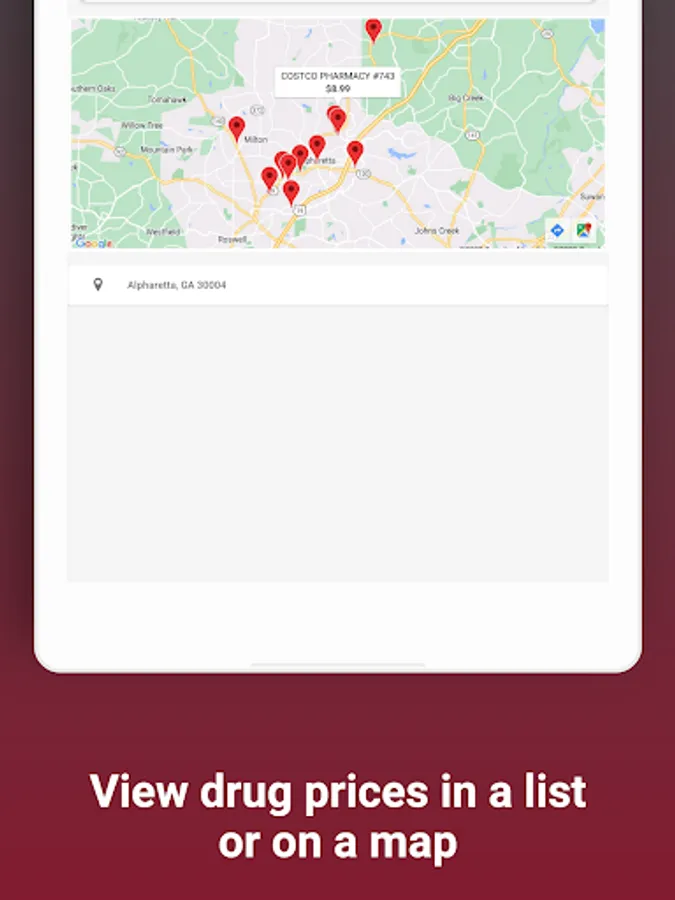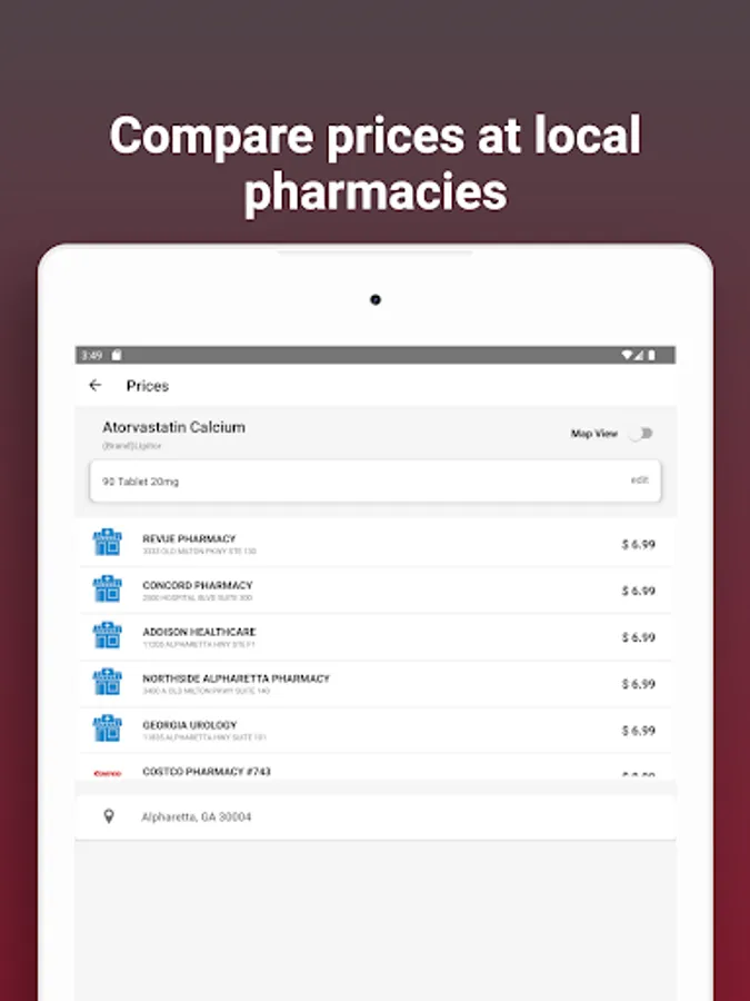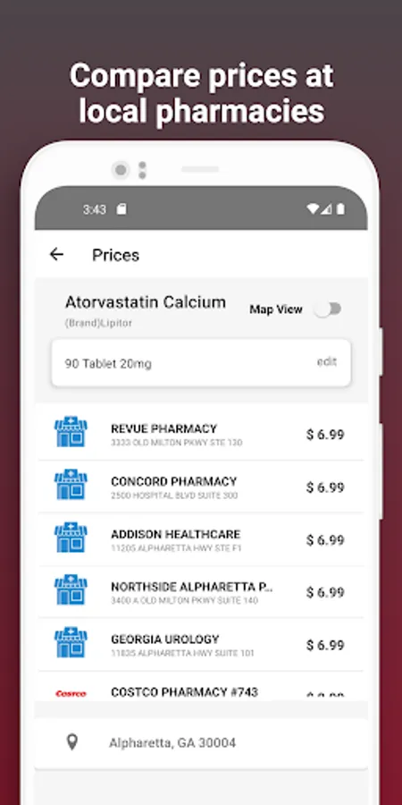 View price results at nearby pharmacies as a list or on the map.
