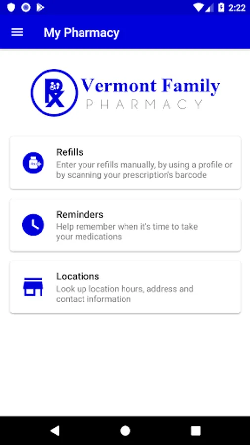 The Vermont Family Pharmacy app allows you and your family to securely communicate with your local pharmacy. Refill your prescriptions with one click, get refill reminders, get discounts at your local pharmacy, get savings on brand drugs and access Pharmacist written pages that help you understand your condition or medications.