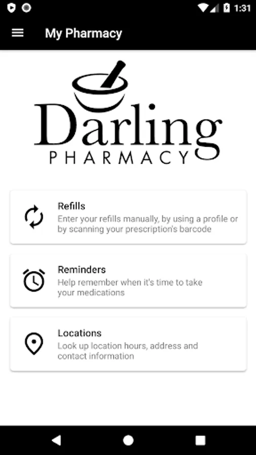 The Darling Pharmacy app allows you and your family to securely communicate with your local pharmacy. Refill your prescriptions with one click, get refill reminders, get discounts at your local pharmacy, get savings on brand drugs and access Pharmacist written pages that help you understand your condition or medications.