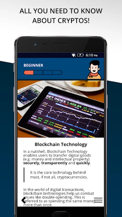Cryptocurrency Trading For Beginners is an interactive app that simplifies the foundation of blockchain technology while introducing you to the concept of Contract For Difference (CFD) trading.