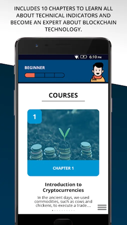 Cryptocurrency for Beginners app explains what you need to know to open a trade and financially gain from the fluctuating cryptocurrency market.