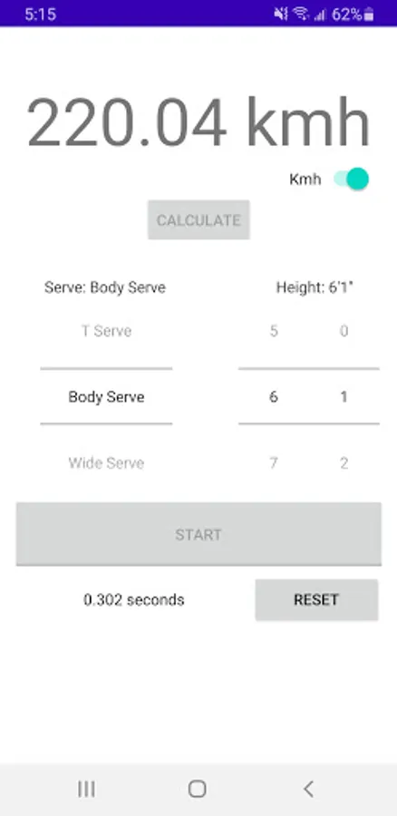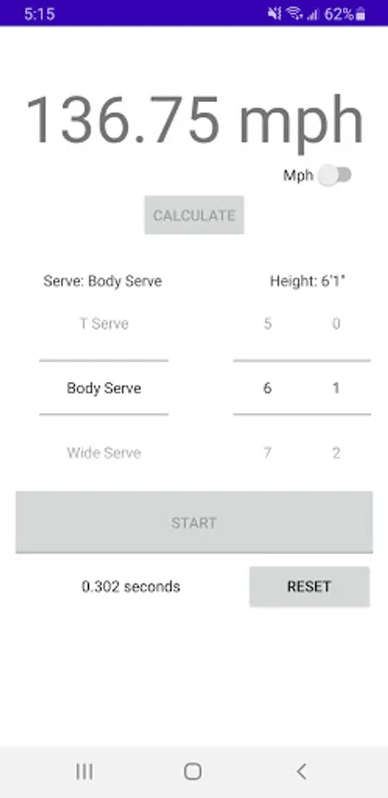 The Tennis Serve Speed Calculator allows you to measure your serve speed accurately, by simply selecting your height, serve location, and time taken for the ball to reach the ground from your racket using the built-in timer.