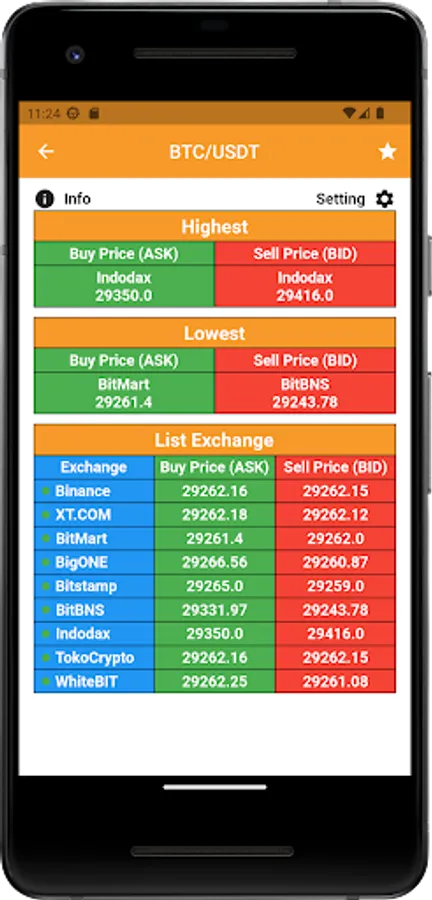 The "Bitcoin Price All Exchanges" application is designed to provide an easy and fast user experience. Users can select the exchange they want to monitor and easily view Bitcoin price data on each exchange directly. Additionally, this application also displays Bitcoin price charts to help users monitor price trends and view the history of Bitcoin price movements on each exchange.