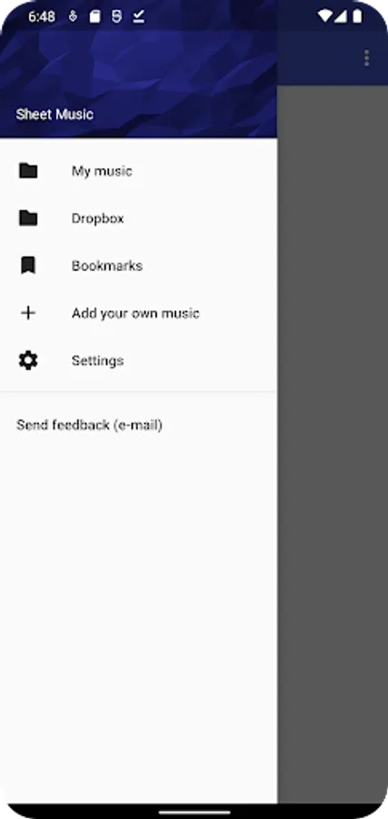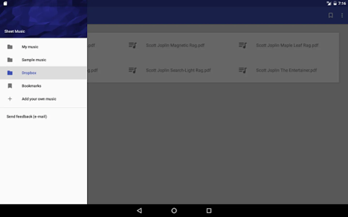 Upload your sheet music from your computer to Dropbox, then open them using the app. Alternatively, you can put music directly on your tablet. PDF, JPEG, PNG and GIF files are supported. For images files, one folder full of images == one piece, so remember to use a separate folder for each piece.