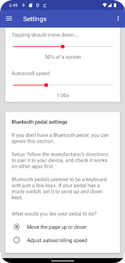 * Bluetooth page-turner pedals (e.g. Pageflip Cidada) on Android 4.4 and later.