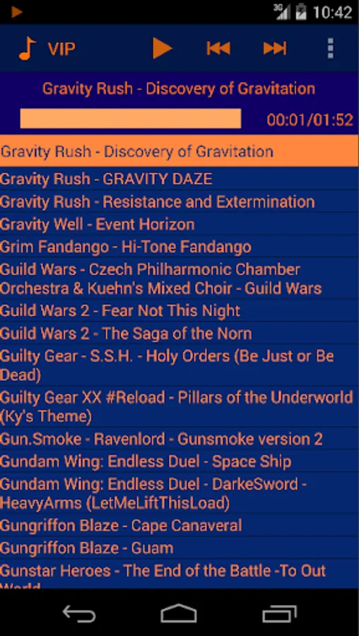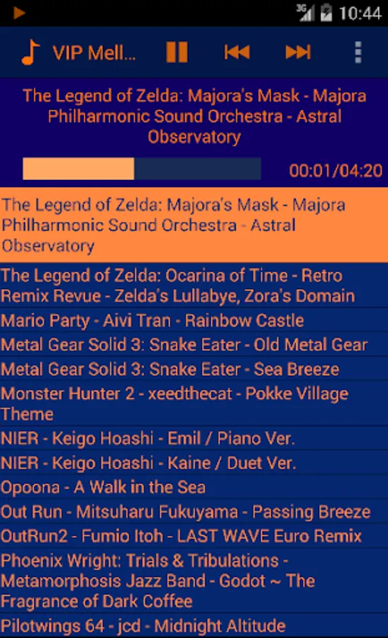This is a media player for the excellent Vidya Intarweb Playlist at aersia.net. It has the same controls as the online flash version. Open the menu to switch between the four VIP playlists: original, mellow, exiled, and source. This app requires a data connection since it streams each music file with no caching.