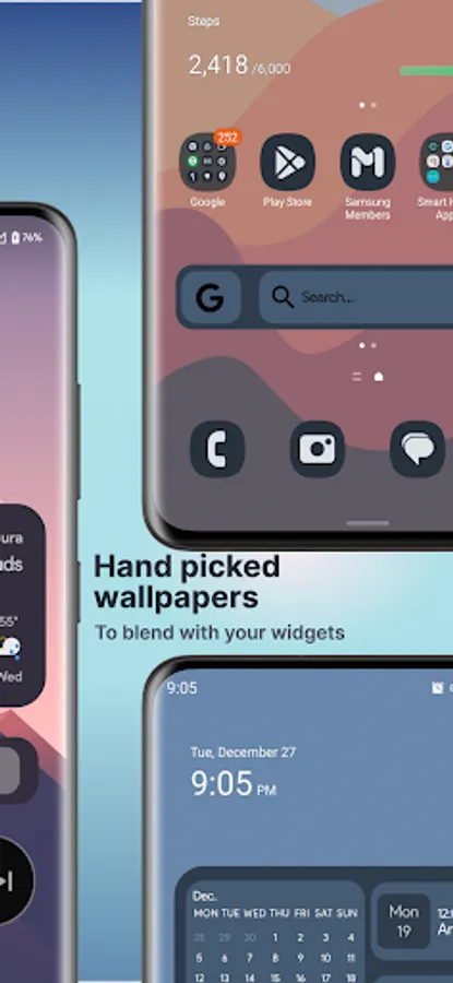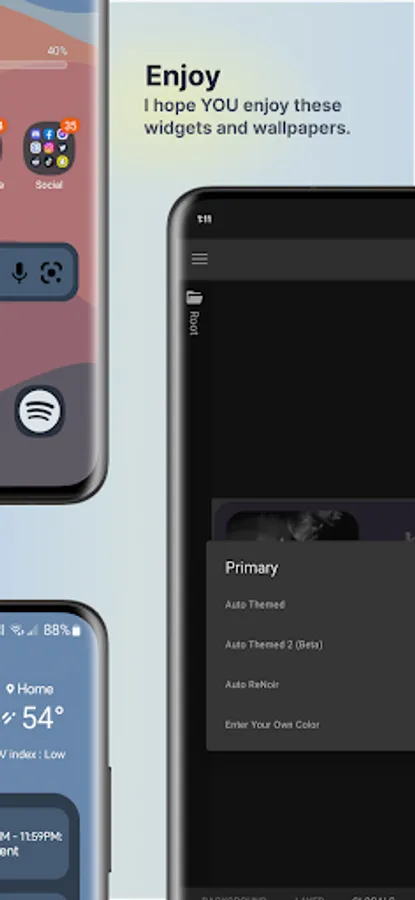• Widgets automatically theme with your wallpaper. To spice things up a bit, all widgets in this pack include global settings within each widget in KWGT! Choose to use the default Auto Theme option or select to use the new Auto Theme 2 (Beta) [Requires KWGT 3.70+]. If you'd like even more control, you can select to use the "Auto ReNoir" or Manual color options.