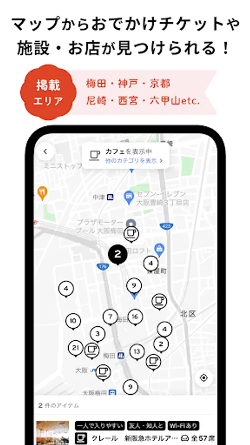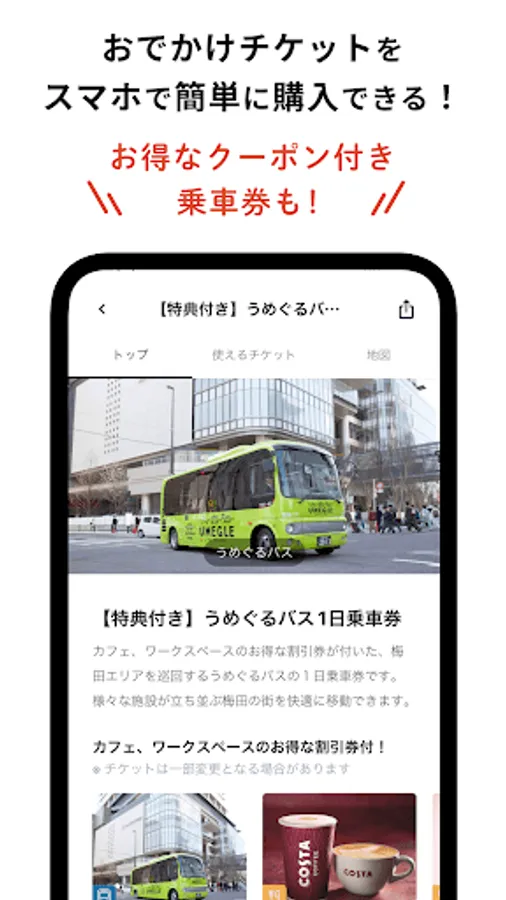 You can use convenient digital tickets such as tickets for the Umeguru Bus, which tours the Umeda area, and admission tickets for outing spots.