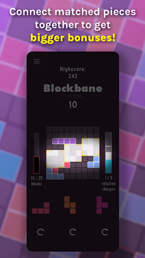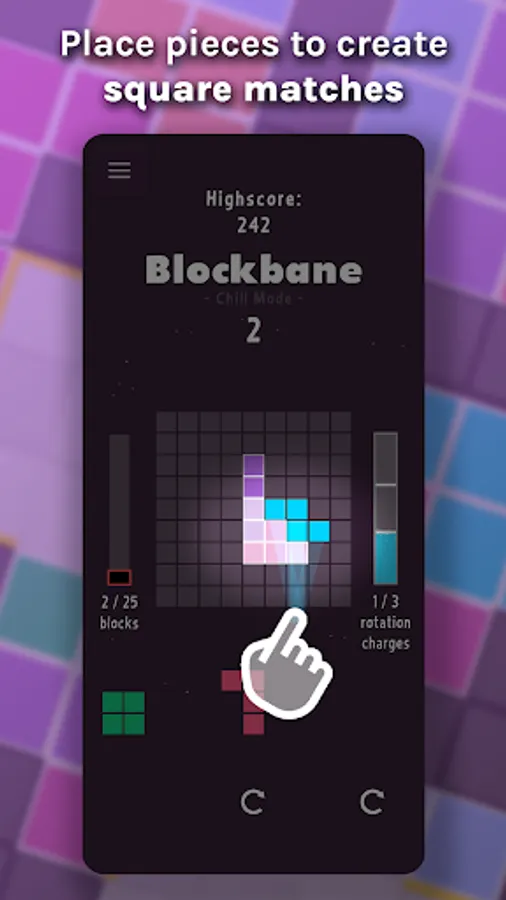 Drag and drop puzzle pieces to make square matches to keep the board clear. Get bigger combos by chaining together larger matches while also unlocking more energy to unlock rotations for your pieces!