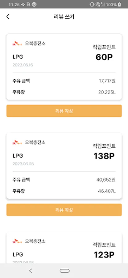 3. 주유 기록부 : 기간별 주유량, 금액 등 주유 적립 이력 확인 가능