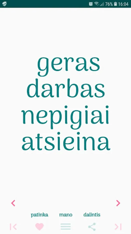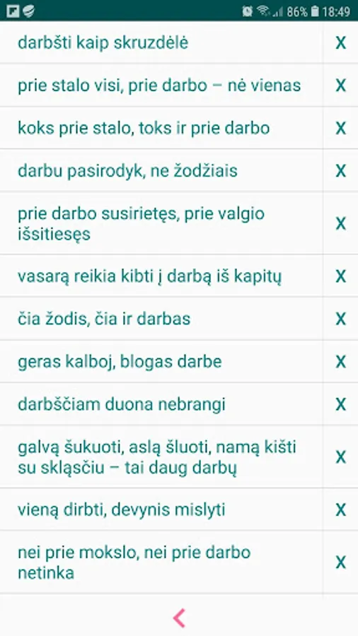 When you turn on the program, one random Lithuanian work proverb appears on the screen. This may be your day's proverb. However, if you want, you can read more proverbs - every time you press the arrow, the proverb field, or swirl your fingers across the screen, it will appear a new random proverb. You can go back and read the proverbs already seen. True proverbs can be saved in your list by clicking on the "like" symbol. This list goes off when you turn off the program. The next time you turn on the program, the random proverbs that you like can be saved to the same list again. Tips are deleted by clicking the "like" symbol again or directly from the list. Proverbs can also be shared.