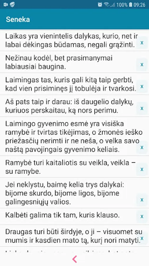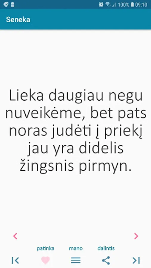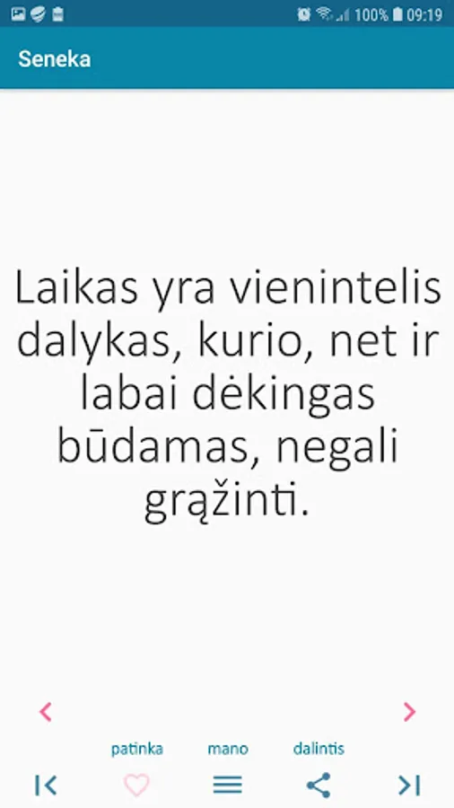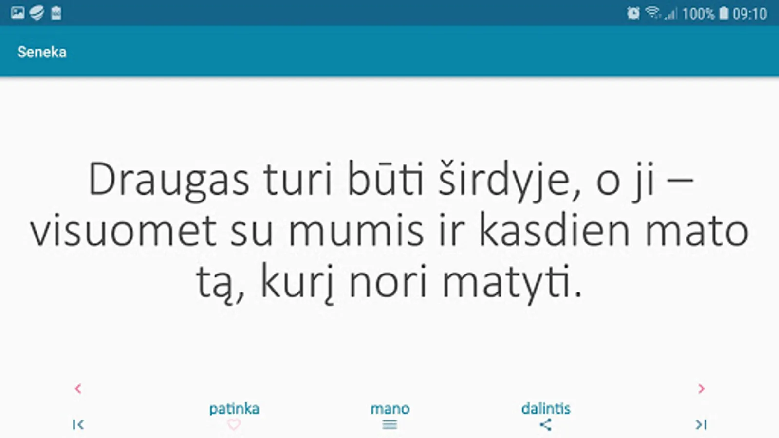 After turning on the gadget, a random quote from the ancient Roman philosopher Seneca's letter to Lucilius appears almost two thousand years ago. It can become your daily quotation, but you can read more of the thoughts of the philosopher. Each time the gadget is turned on, quotes are generated randomly, they can be repeated. Trusted citations can be saved in your list, which, after turning off the gadget, remains. The quotes are saved by pressing the heart symbol, and are deleted either by pressing this symbol again or directly from the list. All quotations are taken from the book: Seneka. Letters to Lucilius. Vilnius: Thought, 1986. There are many great ideas left in the book. Worth to read.