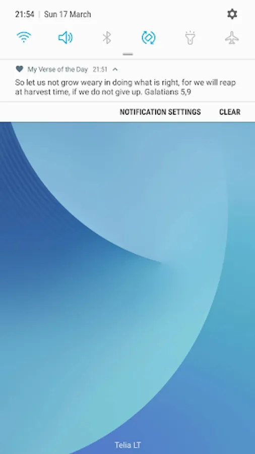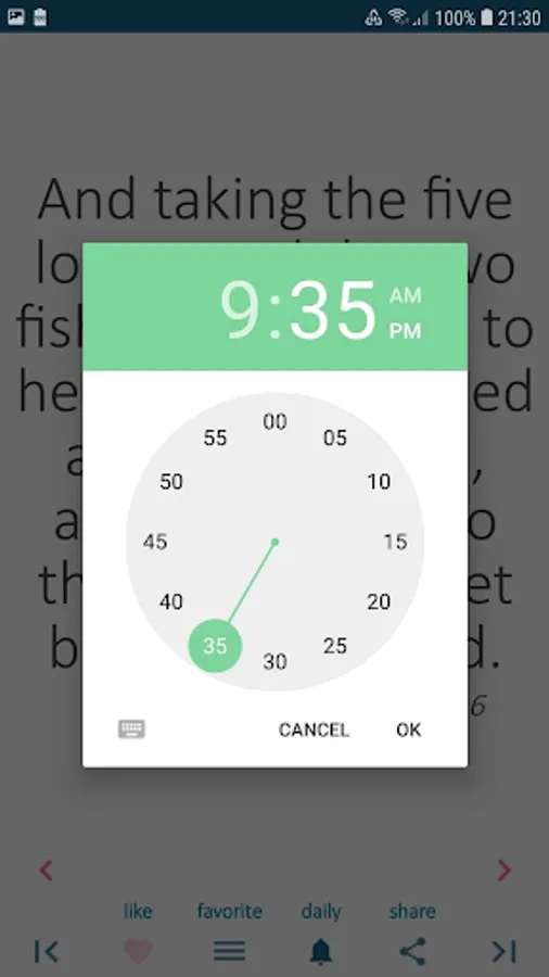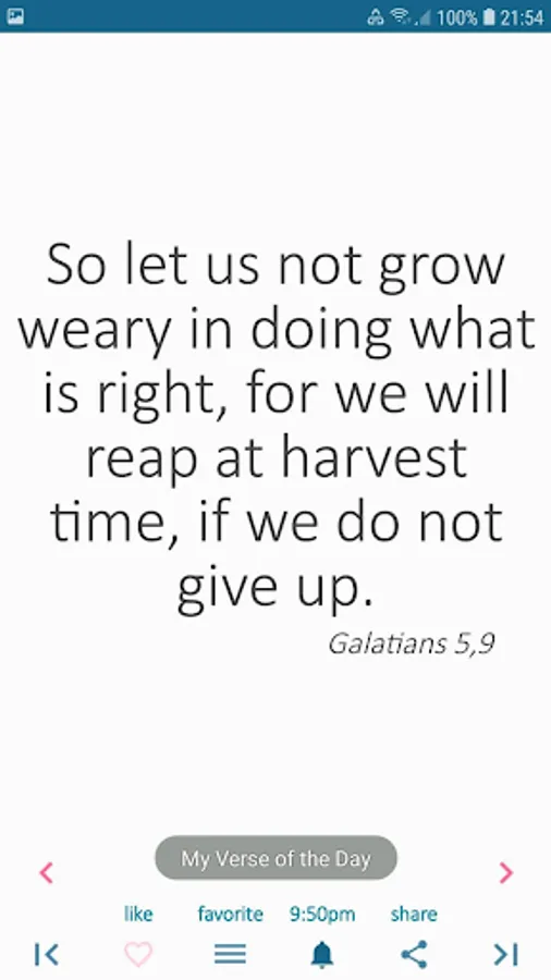 If you would like to receive daily notifications with a short random Bible verse, you can set the time for your daily messages. When you get the notification, you can touch it and, when the app opens, you can save the quote to your favorites list. Every time you open the app, you will first see your verse of that day.