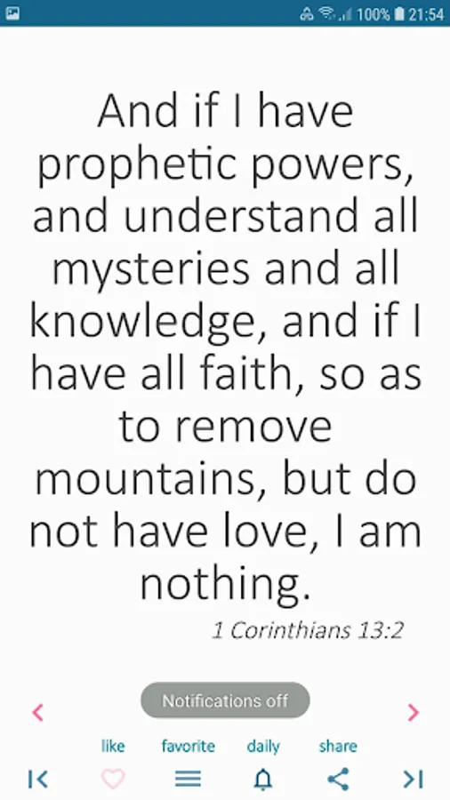 Or you can just read through the Bible quotes provided in the app in a random order. With daily notifications off, the app will always start with a random Bible verse.