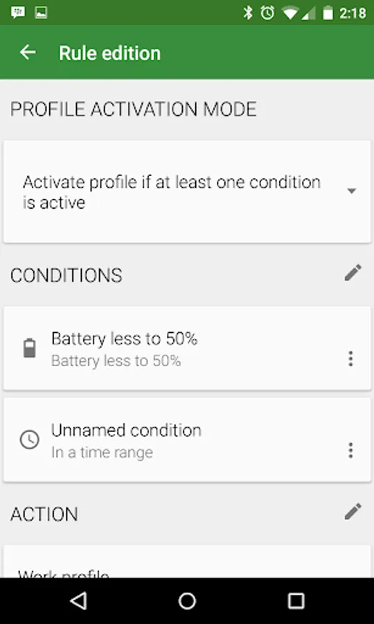 The application allows you to define rules based on the proximity of a bluetooth device, a wireless network, a cell phone anthenna or the level of battery charge.