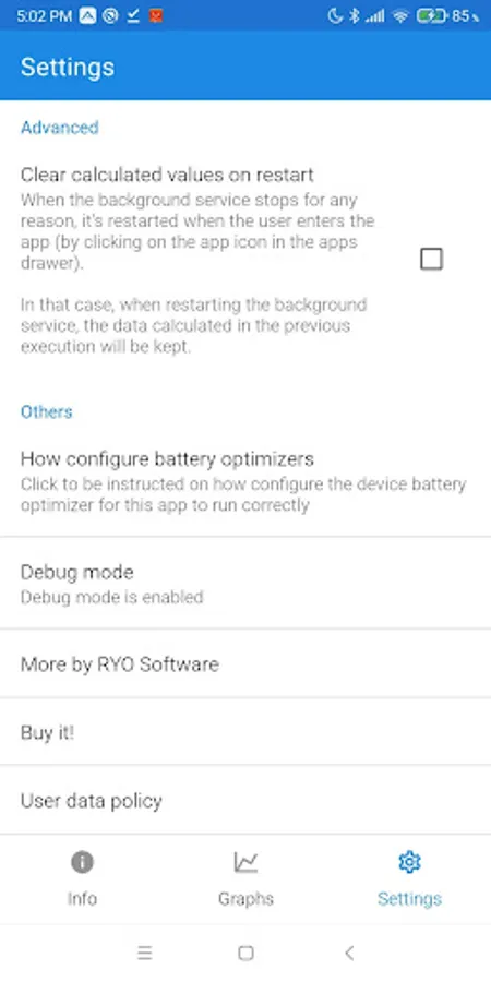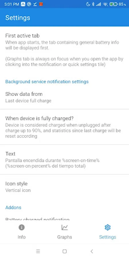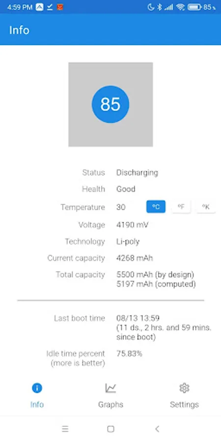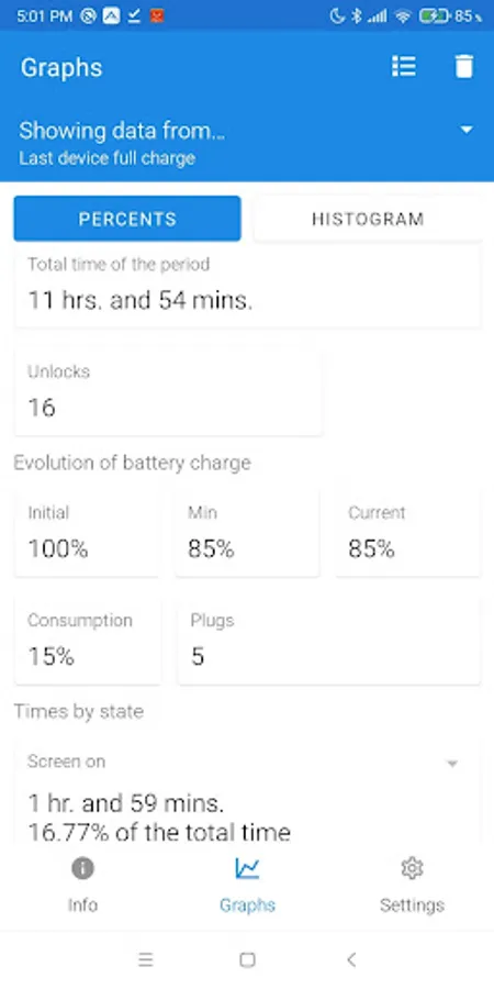 You can see at a glance Information about the status, voltage, technology, current charge (percentage and mAh), and battery capacity, as well as an estimate of its status.We will also show you the percentage of time during which the phone is idle, being able to set custom launch marks.