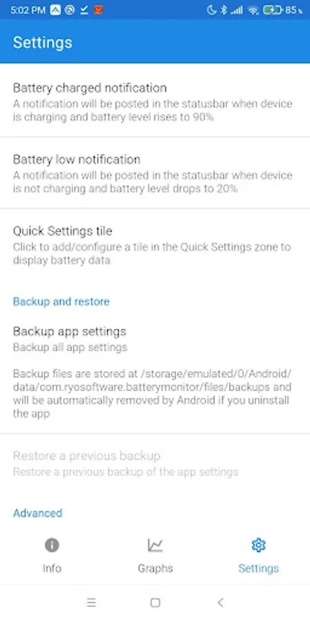 The app also publishes battery event notifications: charged, charging, low... Additionally, you can add a shortcut to the status bar to easily display battery status information.