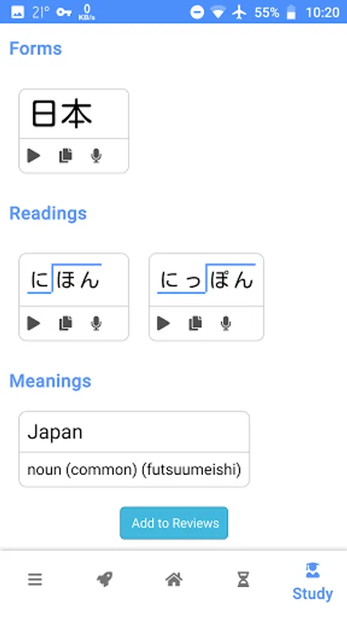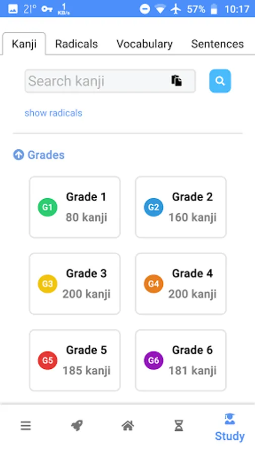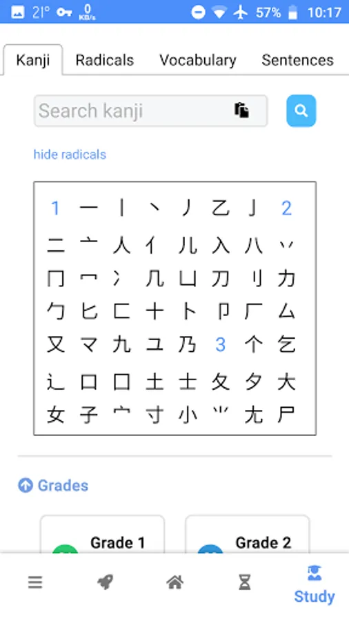 Quickly search and study over 2400 kanji with lists divided by grades, JLPT levels, radicals and components. You can learn the stroke order, find similar looking characters and also study along Genki, RTK, KKLC or Wanikani levels.