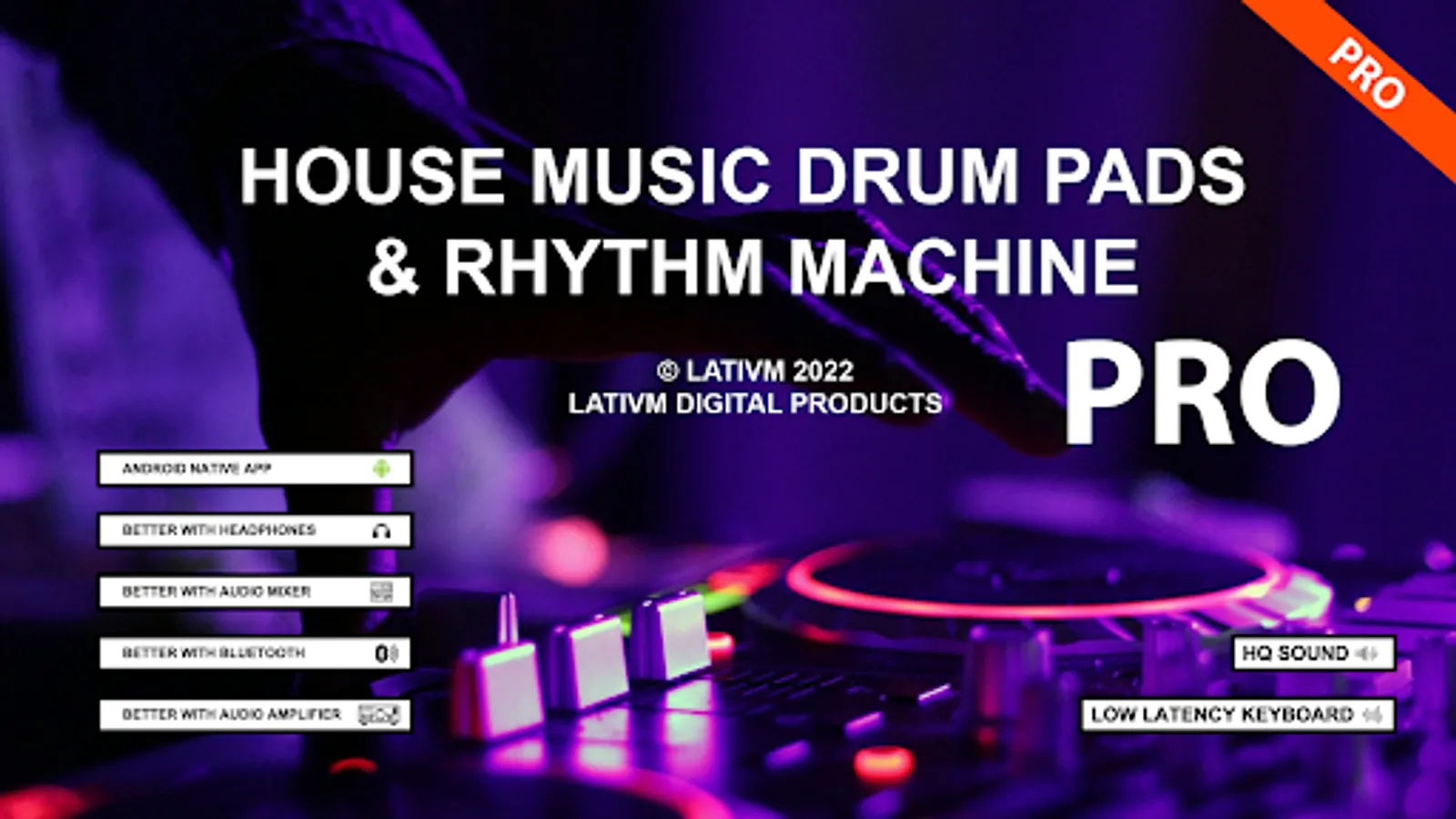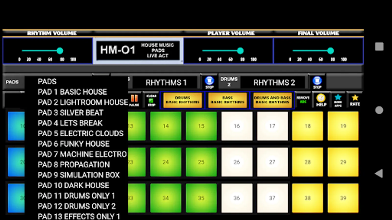 HOUSE MUSIC DRUM PADS & RHYTHM PRO is android application designed for Android phones and tablets. HOUSE MUSIC DRUM PADS & RHYTHM PRO contains 10 combinations of different house music pads with 30 sounds, and 10 rhythm maker patterns with 61 different sounds and effects. You can play HOUSE MUSIC DRUM PADS & RHYTHM PRO pads with virtual keyboard, or you can create your own rhythm and beats sound pattern with customized timeline board.