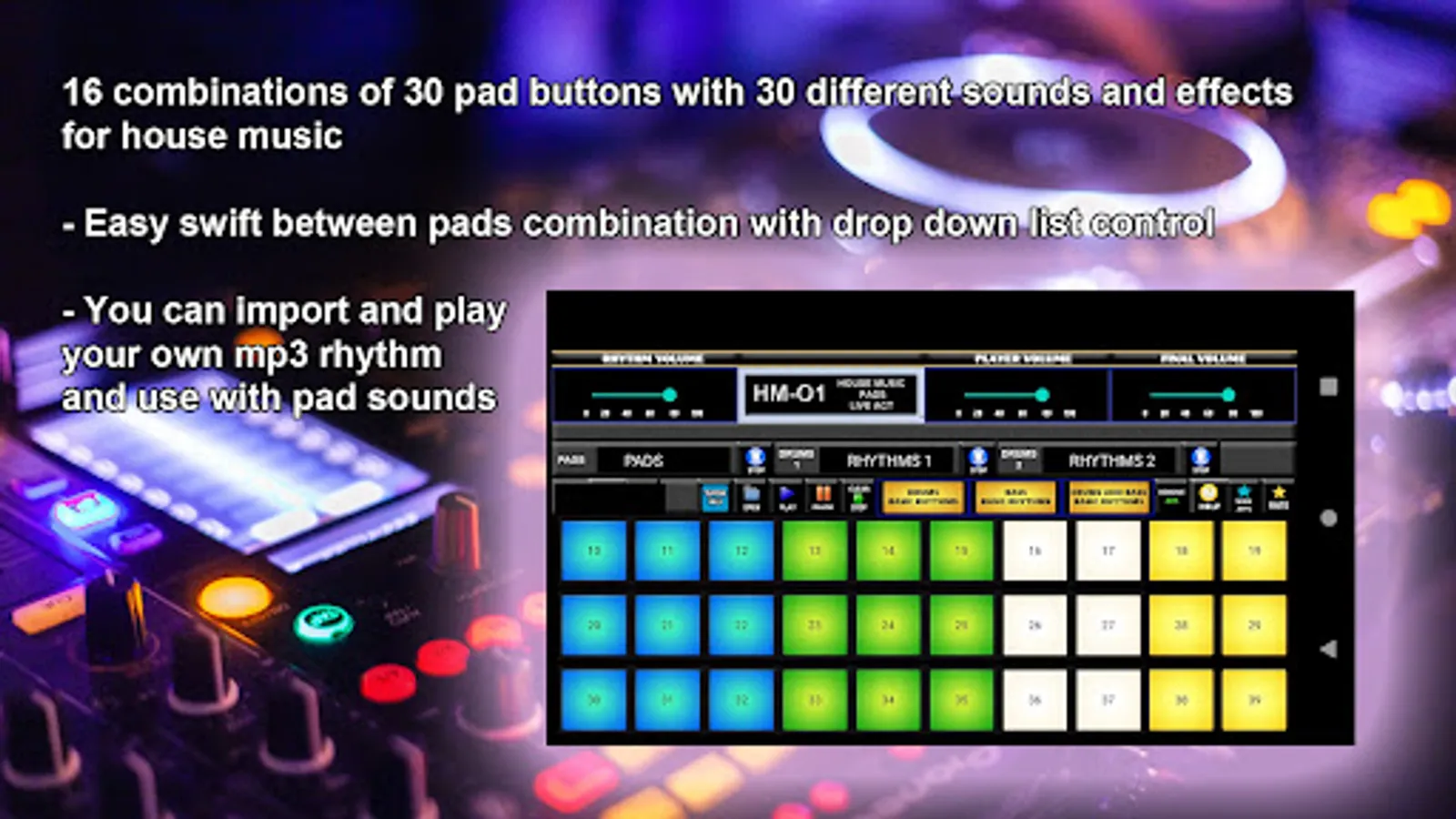 - You can use 10 combinations of 30 pad buttons with 30 different sounds and effects for house music