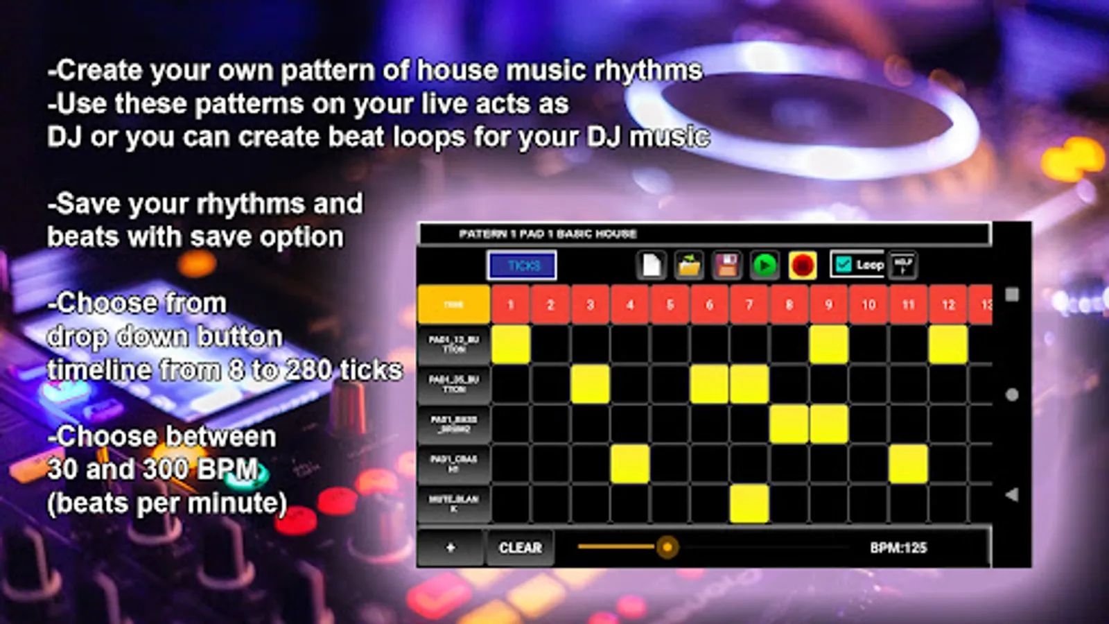 -You can use these patterns on your live acts as DJ or you can create beat loops for your DJ music
