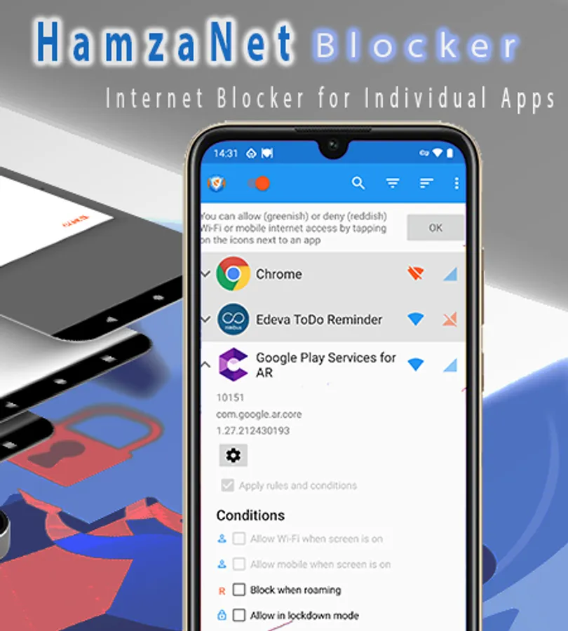 HamzaNet Blocker provides simple and advanced ways to block access to the internet - no root required.