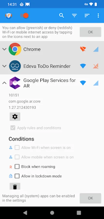 Applications and addresses can individually be allowed or denied access to your Wi-Fi and/or mobile connection.