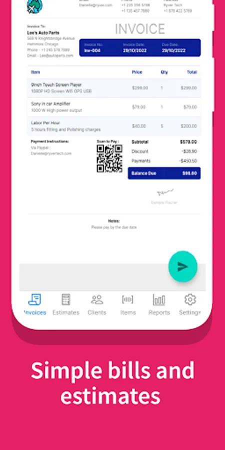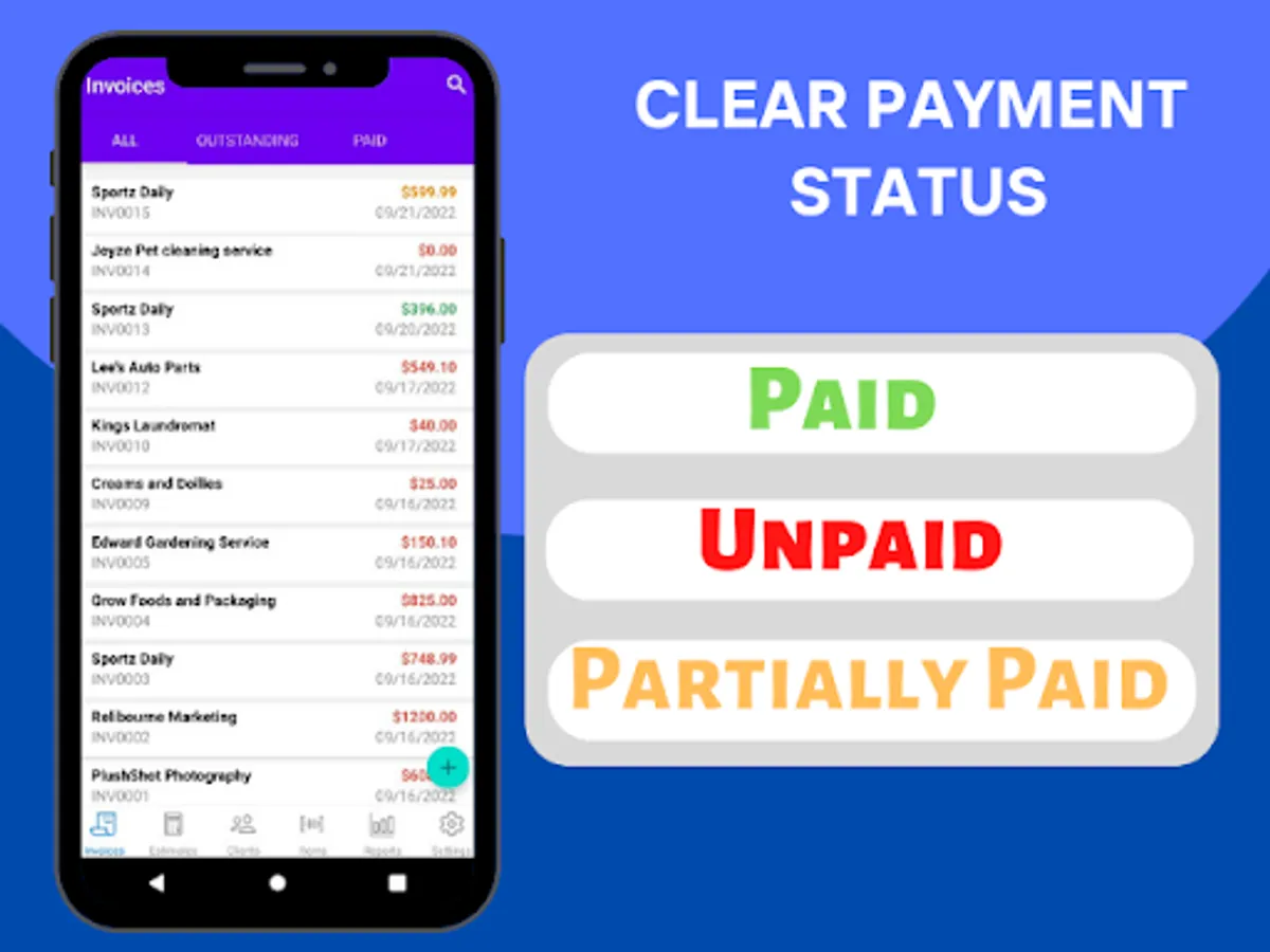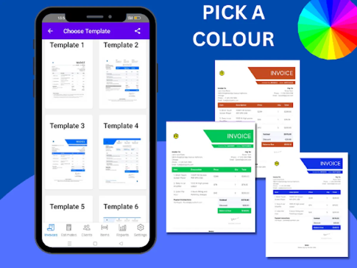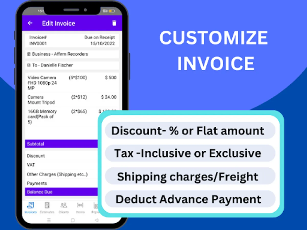 Invoice and Estimate Creation: Create invoices, quotations and estimates easily by adding your business details, client details, and items to be invoiced. Our app offers a wide range of professional invoice templates that you can use to create polished and branded invoices for your clients. You can choose from various formats, such as invoice numbers, invoice headers, and footer notes, to customize your invoices according to your business requirements. You can also add your company logo and customize the colors to create a consistent branding experience for your clients.